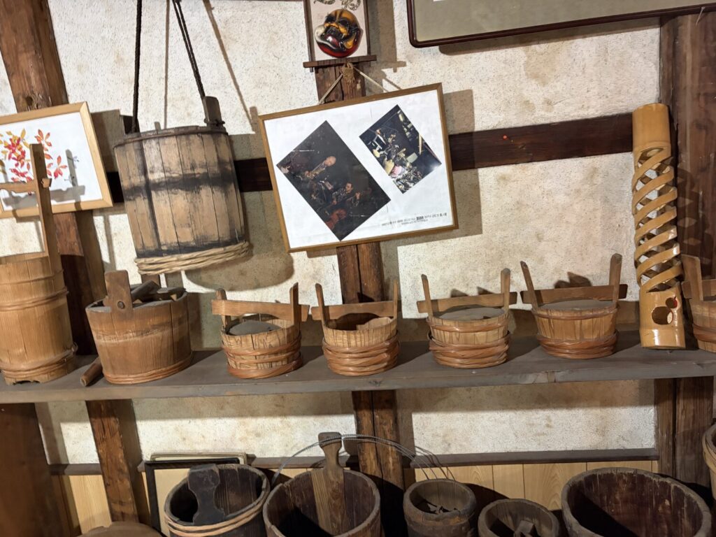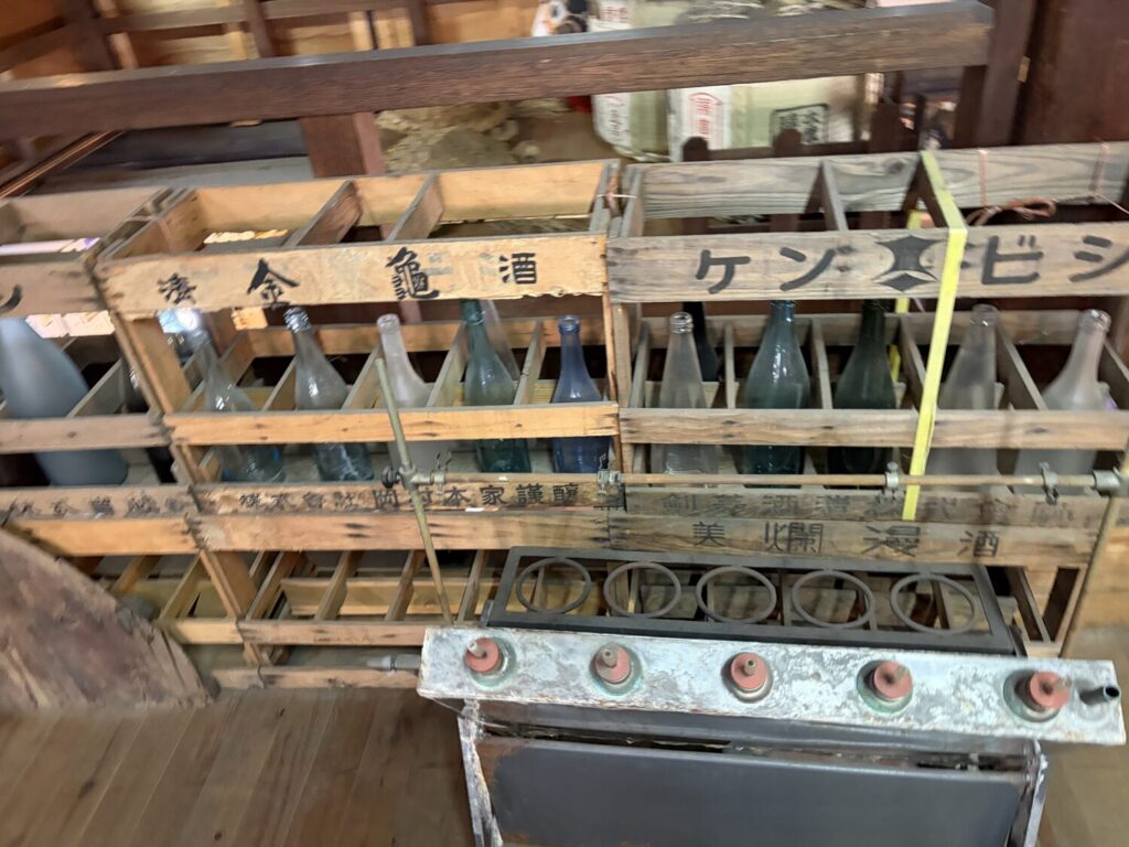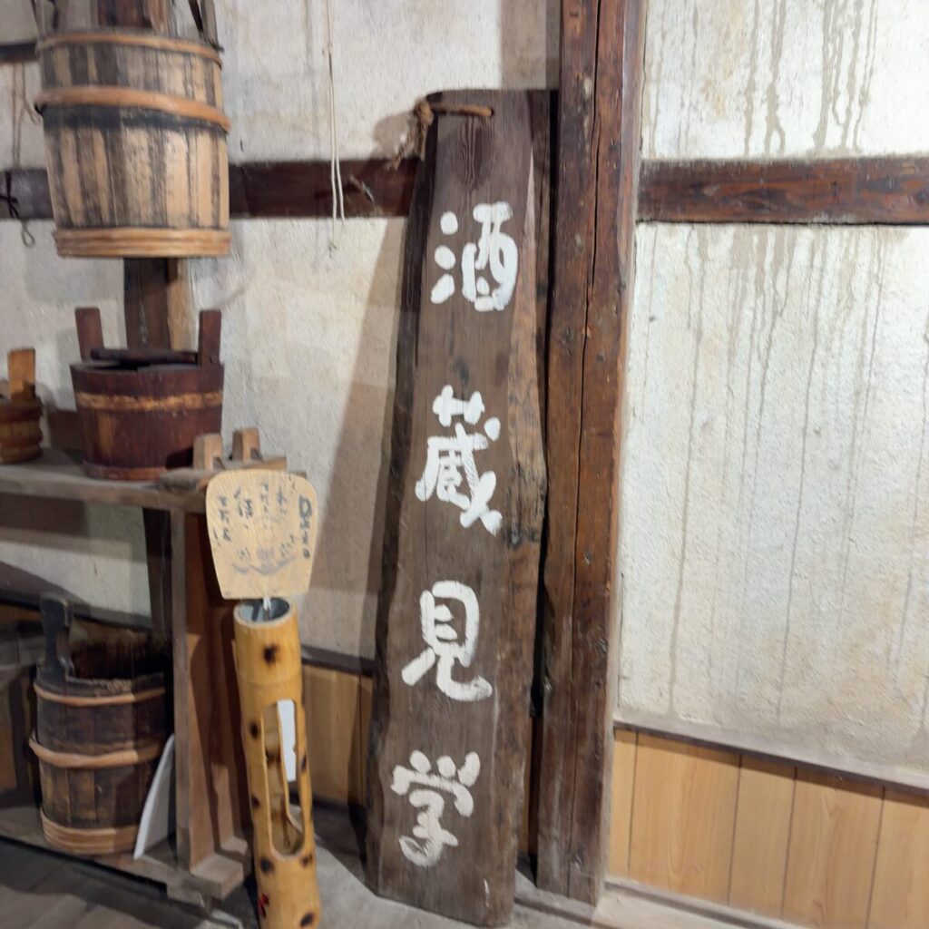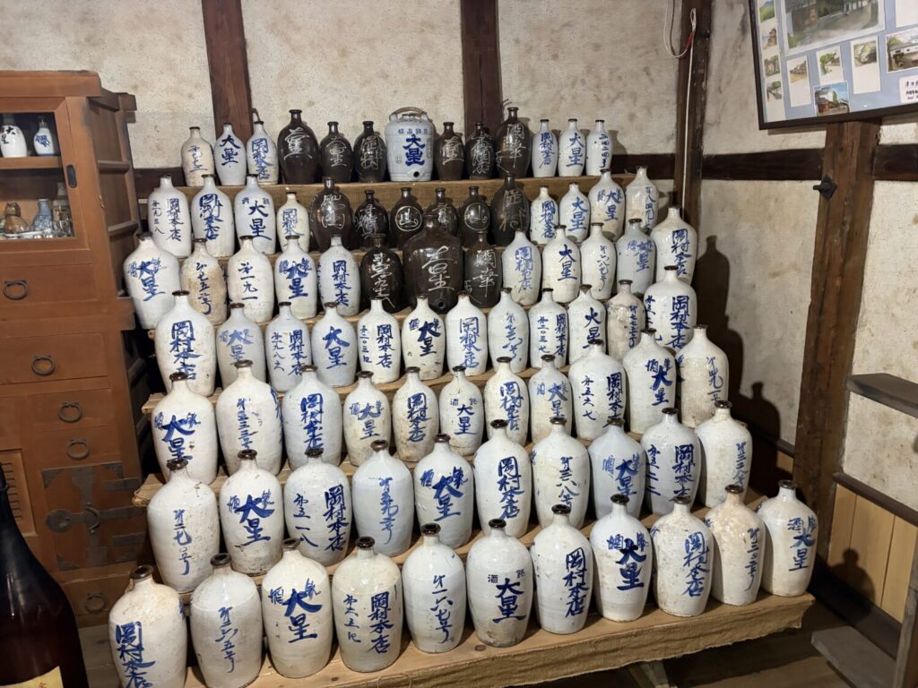 こちらが酒蔵です。酒蔵も歴史が感じられるものでしたが、飾られている酒壺や酒道具も年季が入っていますね。