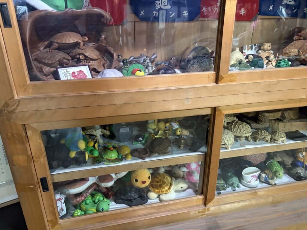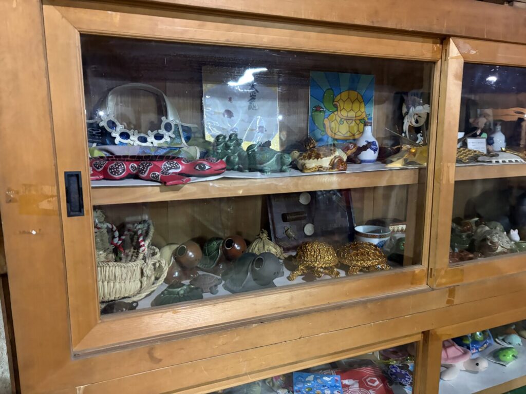 こちらには置物だけでなく、ぬいぐるみの亀も。金亀だけに、時間をかけて亀のものを集めたのでしょうね。