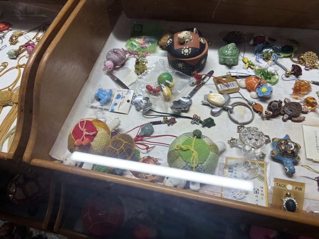 こちらも亀の小物です。根付や飾りもあります。ちょっとした亀小物の博物館のようです。