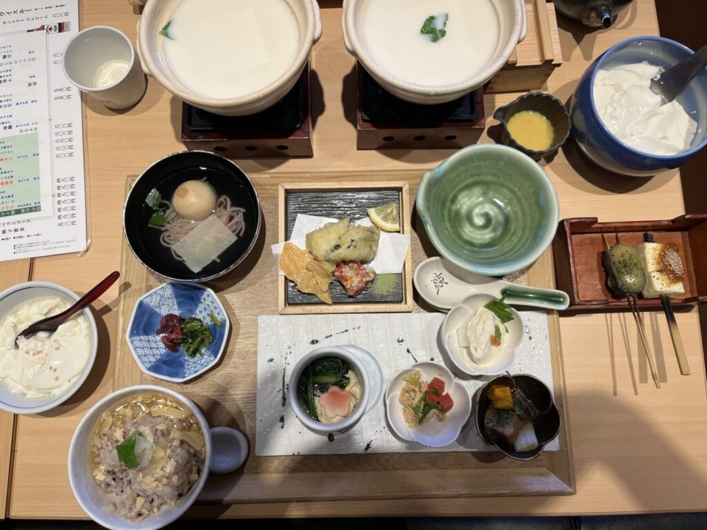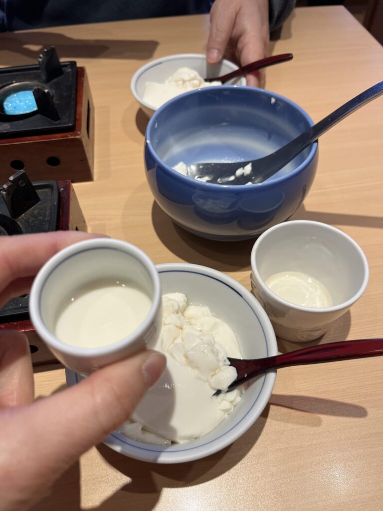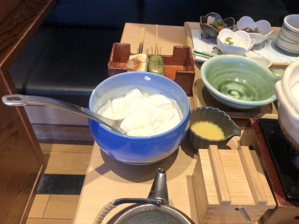 おぼろ豆富は大きな鉢にたっぷり入ってやってきます。そこからすくって食べるのですが、ふんわり大豆の香りがしてほんのり温かくおいしいんです。これが何度でもおかわりできるなんて、それだけで贅沢ですよね。