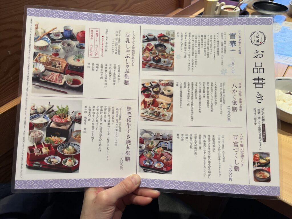 「八かく庵」いかがでしたか?こちらはお店にあったお昼のランチメニューです。実は、こちらには京麩会席のメニューは載っていません。つまり、当日京麩会席を食べようと思っても注文することはできません。京麩会席は必ず前日までの予約が必要です。京麩会席が気になるという人がいれば、必ず予約しておきましょう。