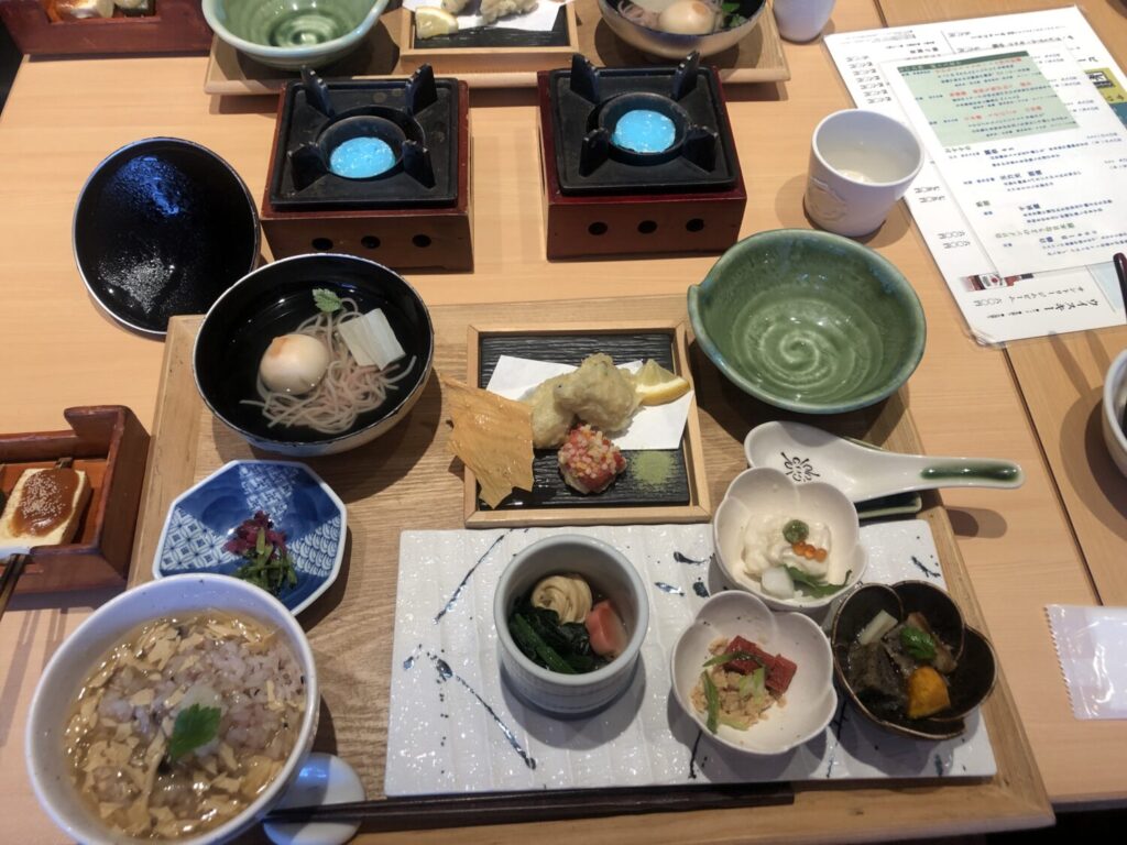 さっそくやってきました。こちらが京麩会席です。ずらっと並んだお料理がなんとも豪華。先付け、京麩彩り一の膳、煮物椀、お造り、焼物、食事(お茶漬け)、甘味がお膳で2~3回に分けて出てくるのですが、そのどれにも豆富やお麩が入っていて、色んな調理法のお麩が楽しめます。