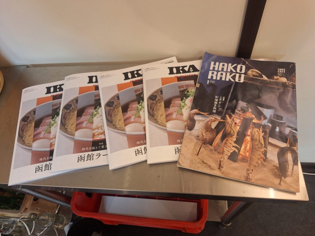 セルフサービスのお水容器の近くに、函館のフリーペーパー置き場があります。自由に持ち帰っていいみたいです。観光で函館にいらした方も、フリーペーパーで函館のグルメスポットなどを探してみてはいかがでしょうか。
