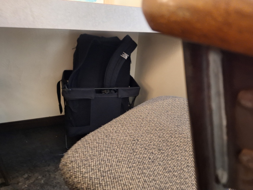 店内はカウンター席が8席あります。テーブルと椅子の下に荷物置き場があります。8席分すべてに荷物置き場が配置されていますね。