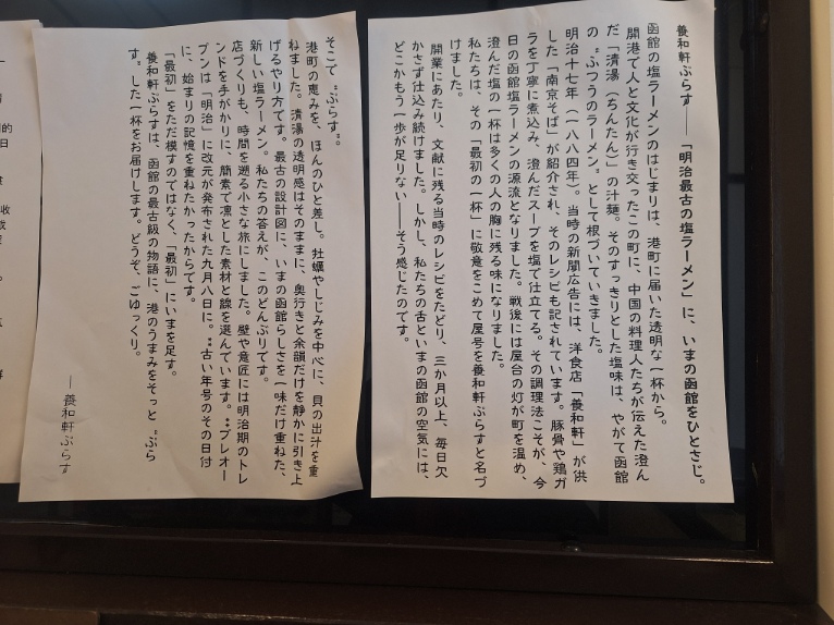 カウンター席には、養和軒ぷらすの「ひとさじ」が書いてあります。塩ラーメンが出来あがるまで、函館の塩ラーメンの歴史を読んでみましょう。