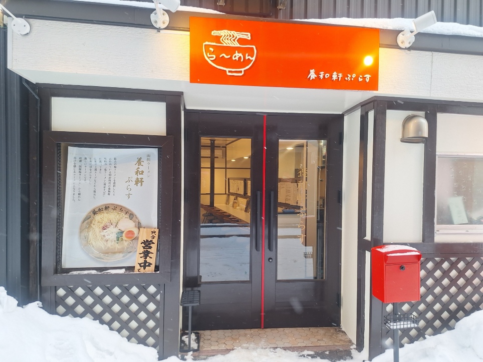 外観はこちら、営業中という看板とともに、目立つラーメンの写真と解説があります。「養和軒ぷらす」と書かれている赤い看板がお店の目印です。