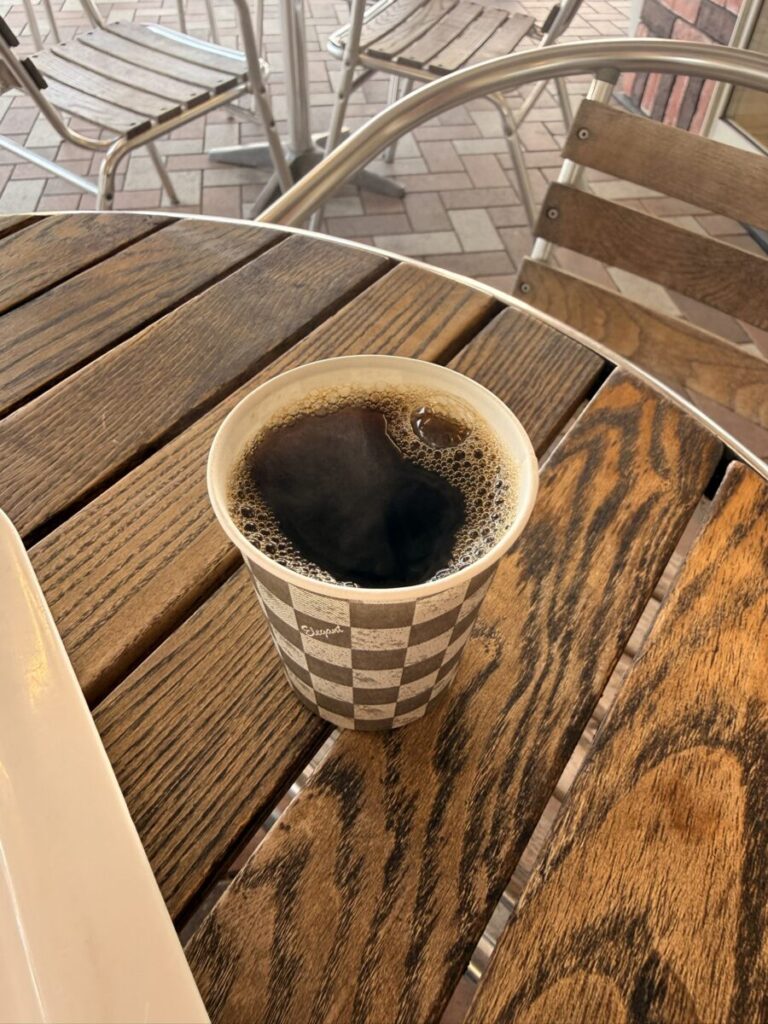 そして驚くことに、コーヒーも無料なんです。パンを購入した時に紙コップを人数分もらえるので、そのままコーヒー、またはスープをセルフサービスで利用できます。私はコーヒーを、娘はスープを選んで、パンと一緒に飲んでいます。イートインコーナーを利用している皆さんもセルフサービスのドリンクを利用していました。