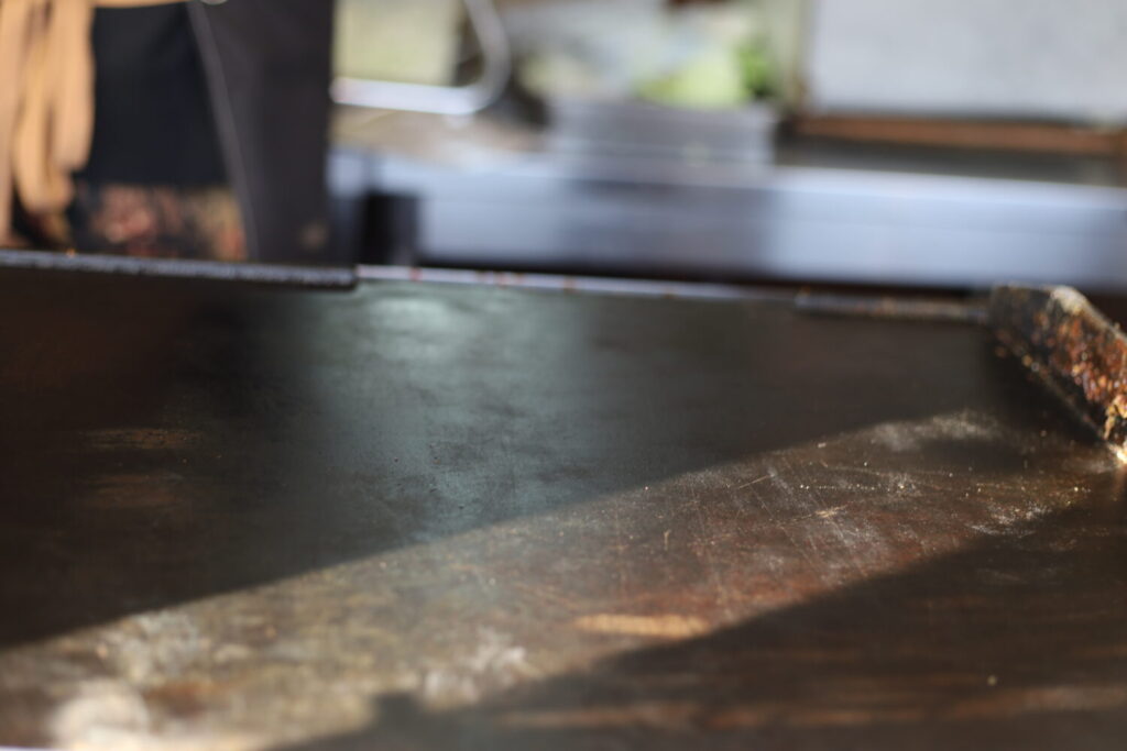 三津浜焼き「しん堂」の魅力は、シンプルながらも計算された焼き方にあります。鉄板の上で重ねられる生地、キャベツ、麺、卵。それぞれの火の入り方が絶妙なバランスになるよう、工夫しているそうです。