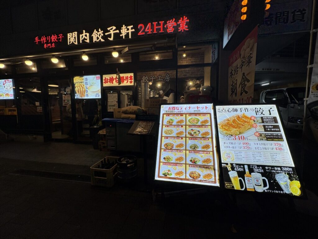横浜・関内エリアで夜遅くまでにぎわいを見せる通りの一角にある「関内餃子軒」。赤く光る看板と「24H営業」の文字が目印で、時間を気にせず立ち寄れる安心感があります。