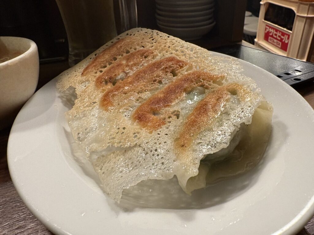 セットに付いてくる餃子も印象に残る一品です。焼き目のついた面はこんがりとしていて、羽根はパリッと軽やかな食感。