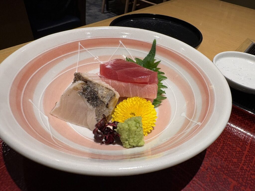 刺身は本マグロの赤身とトロ、そして炙り鰆の三種。赤身のすっきりとした旨味、トロの脂の甘さ、炙りによる香ばしさと、それぞれに異なる方向の味わいが用意されており、牛鍋とは違った楽しみを挟み込む役割を果たしています。