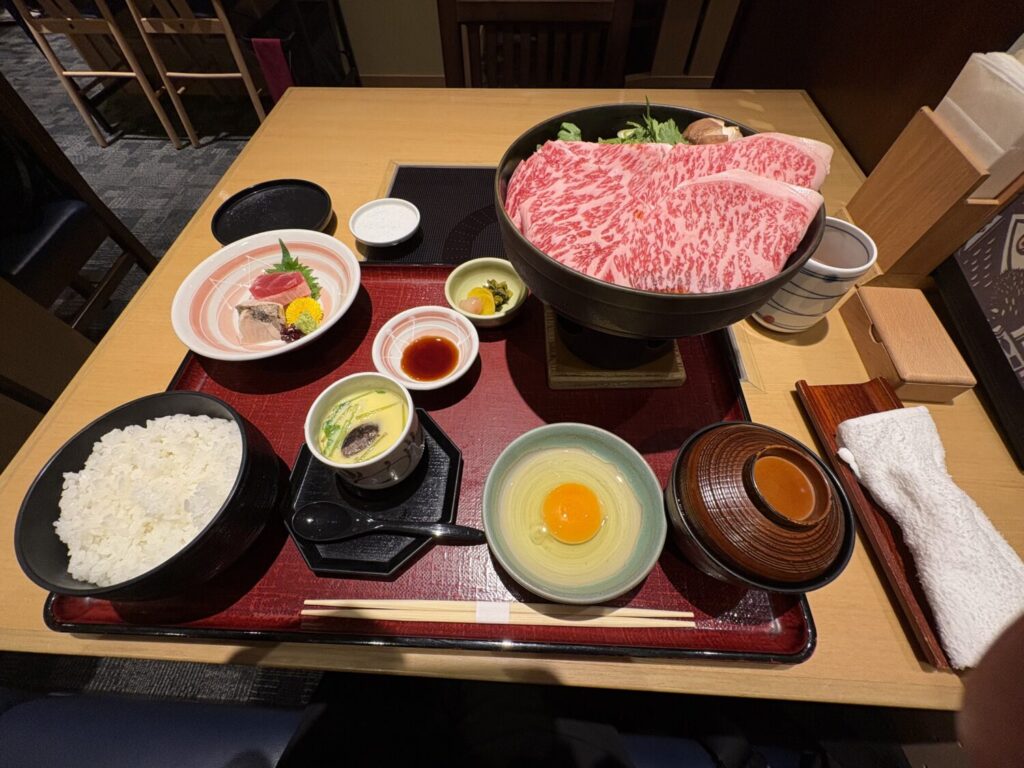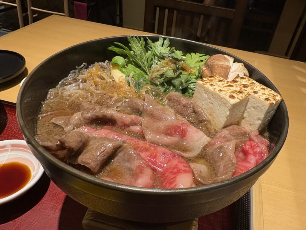 今回いただいたのは「牛鍋御膳(松)」。鍋だけではなく、刺身や茶碗蒸し、甘味までがセットになっています。配膳された瞬間、整然と並ぶ器と、中央に据えられた牛鍋の存在感が目に入ります。