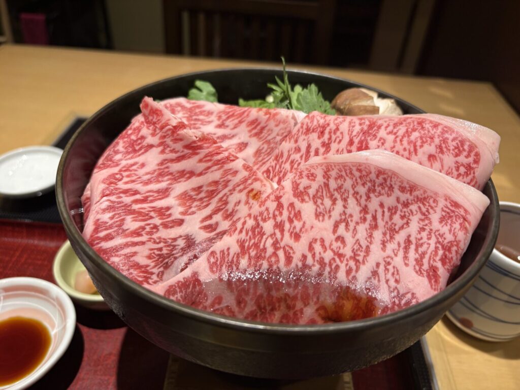 まず主役となる牛鍋は、火を入れる前の状態で提供されます。器の中に広げられた牛肉は一枚一枚が大きく、細かく入ったサシが均一に広がり、見た目にも質の高さが伝わります。下にはすでに割り下が入り、火を入れる準備が整えられています。