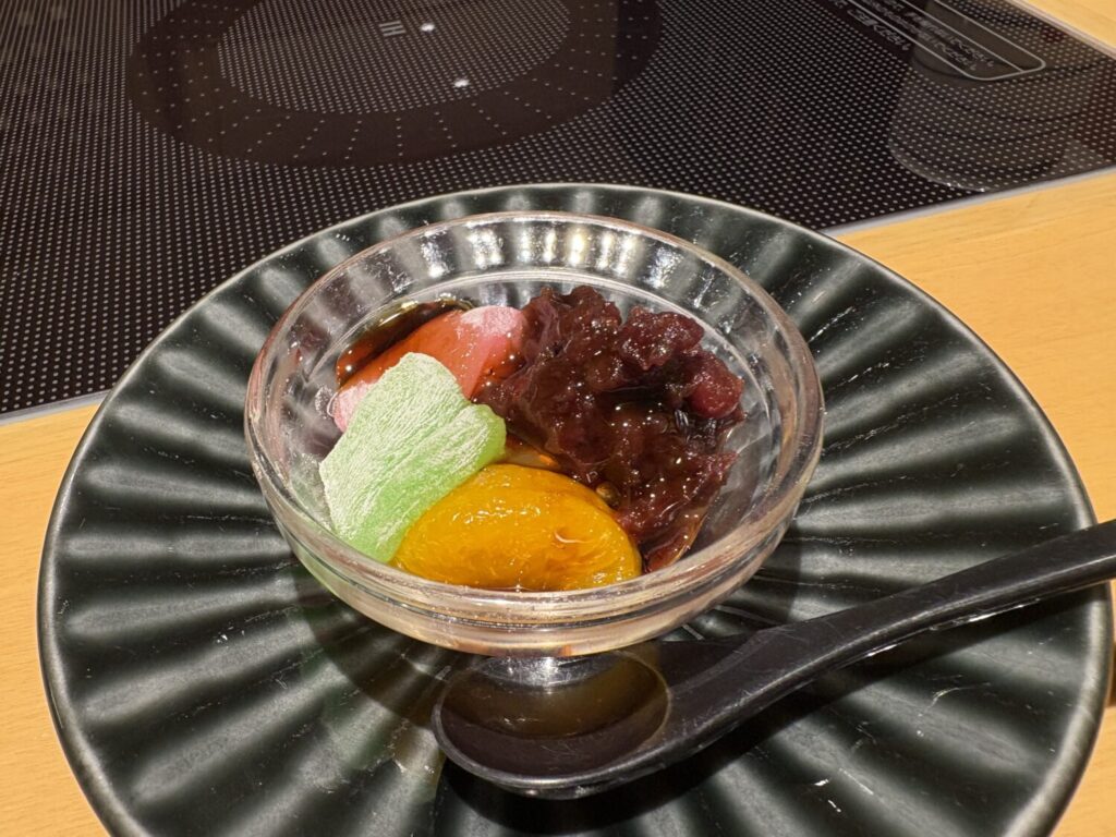 さらに茶碗蒸しや香の物、ご飯、味噌汁が並び、最後にはあんみつが控えています。