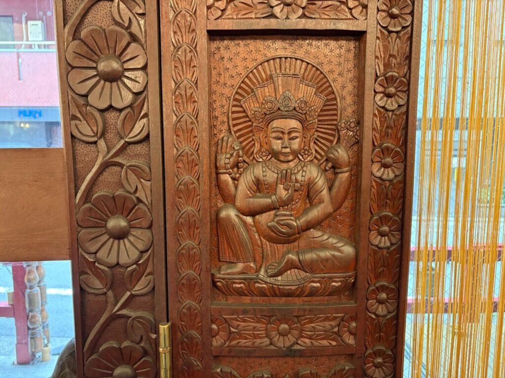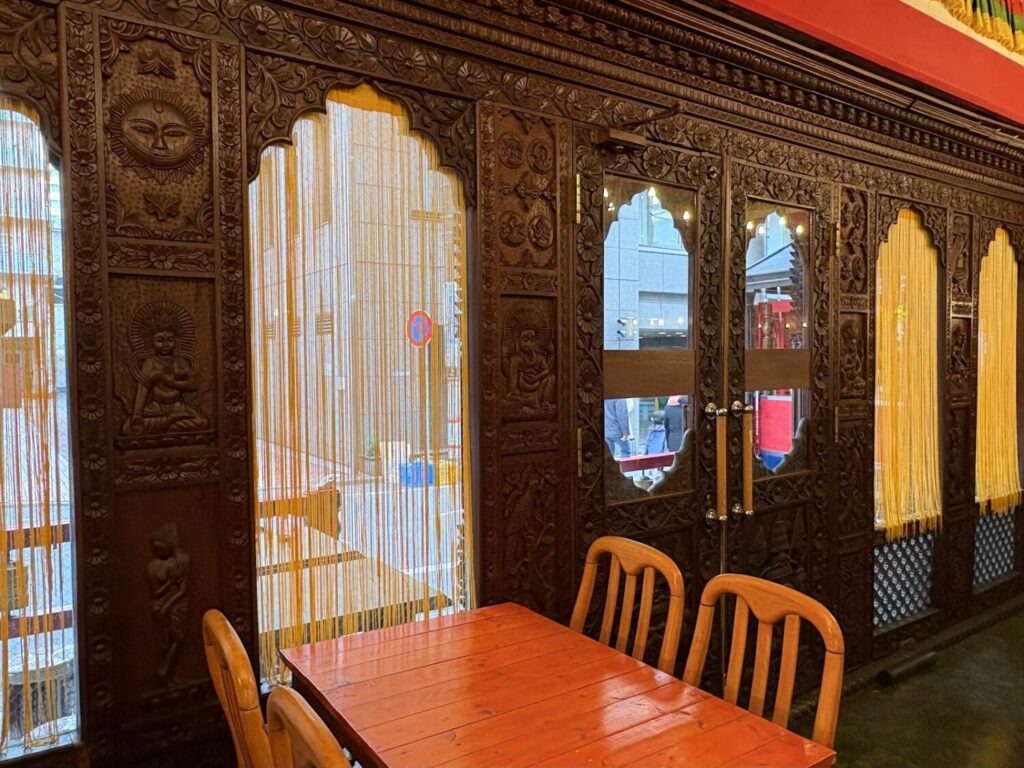 扉を開けて店内に入ると、まずは煌びやかな内装に驚かされます。こちらの木彫り細工の飾り窓は、ネパールで116人の職人が、5ヶ月もの時間をかけて一本の木から制作したものです。細部まで美しく、模様をじっくり眺めたくなります。