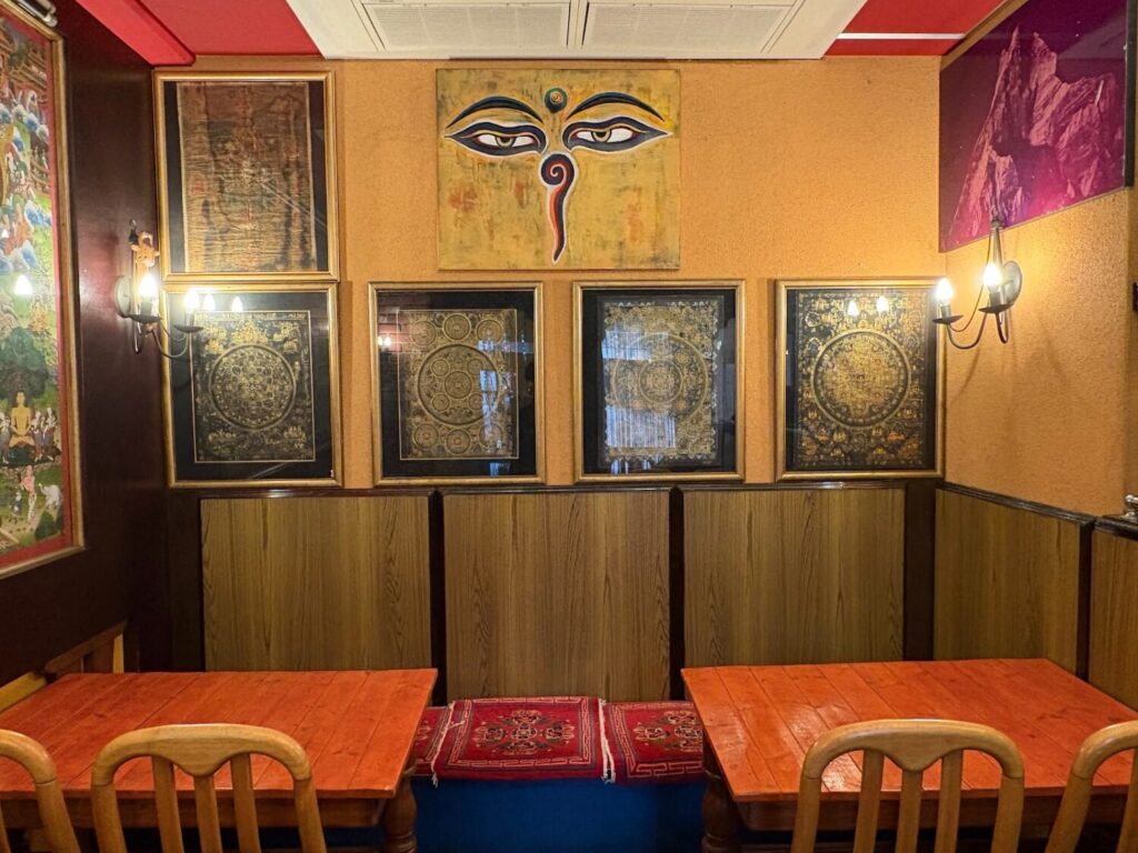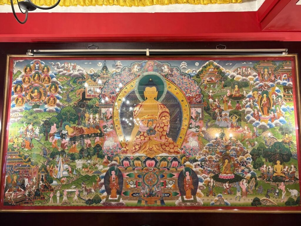 奥の壁には、大きなチベット・ネパール仏教絵巻が飾られています。一枚の布に釈迦の一生が描かれているそう。鮮やかな色味がひときわ目を引きます。