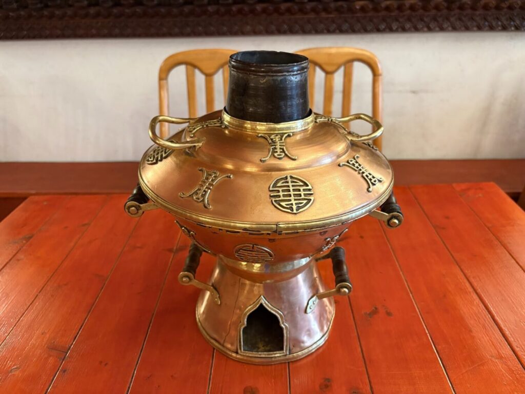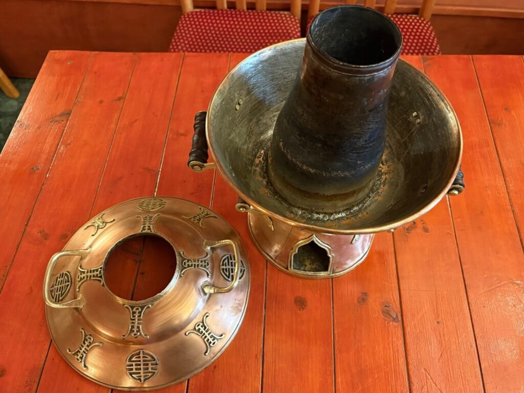 鍋の仕組みが特徴的で、鍋下部の穴から熱するのかと思いきや、ここは空気の通り道。中央の煙突のような部分に上から炭を入れ、周りの隙間にスープと具材を入れて温めます。