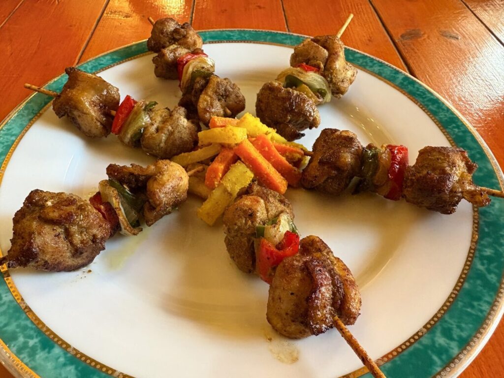 シンケ ククラはネパールの焼き鳥のこと。ガラムマサラをはじめとするネパールのスパイスが、鶏肉の旨みを引き立てます。間に挟まっているパプリカ、玉ねぎがとても甘く、スパイシーな鶏肉とのバランスが良いです。