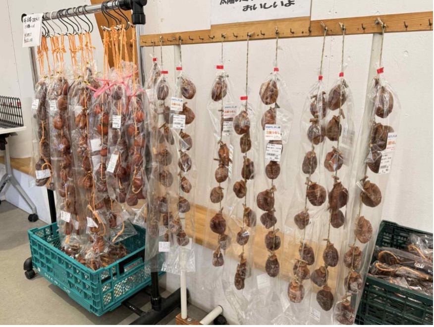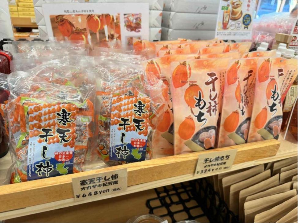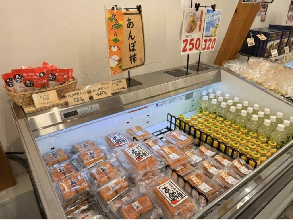かつらぎ町では果樹栽培が行われており、柿は地域を代表する農産物の一つとして知られ、加工品を含めたさまざまな形で柿が並んでいました。かつらぎ町には多くの柿の特産品がありますが、その中でも冬や春先に外せない味覚として知られているのが、干し柿やあんぽ柿です。