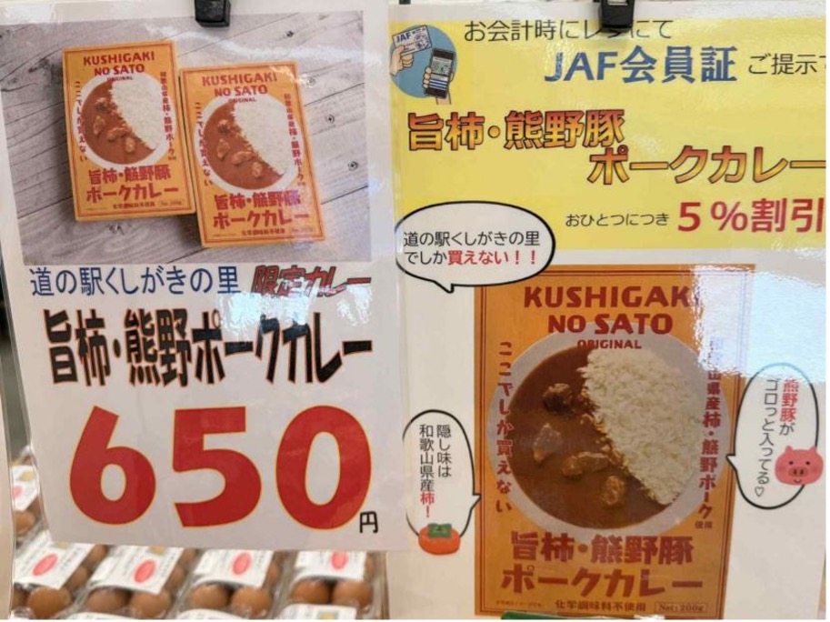 道の駅でしか買えない、面白い限定商品を発見しました!その名も「旨柿・熊野豚ポークカレー」です。カレーに旨柿という意外な組み合わせが目を引きました。