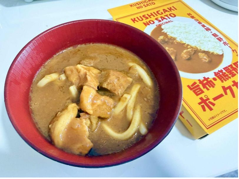 さっそく「旨柿・熊野豚ポークカレー」を食べてみました!カレーライスか、カレーうどんにするか悩みましたが、今回はカレーうどんにしてみました。封を開けた瞬間、カレーの良い香りがします。