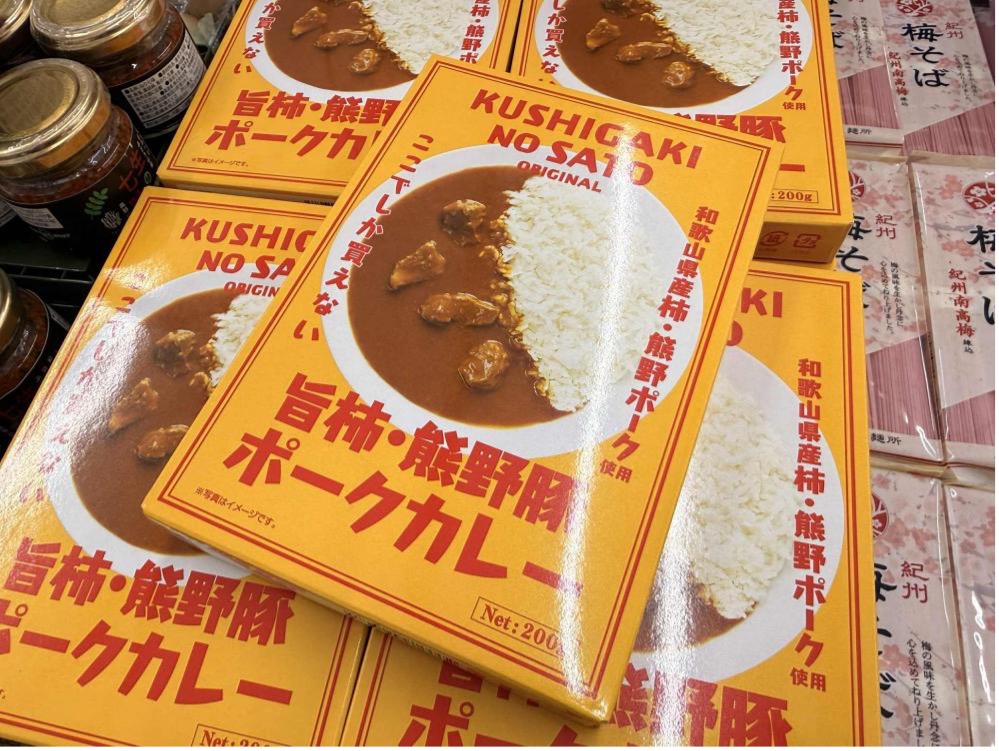 この商品は、和歌山県産の柿と熊野豚を使用したレトルトカレーで、道の駅「くしがきの里」限定の商品として販売されています。常温保存が可能なレトルト食品なので、自宅用はもちろん、お土産にも最適ですね!