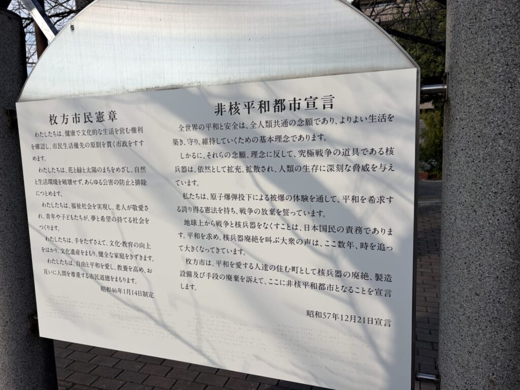 こうした歴史を忘れず、未来へ伝えるため、枚方市は1982年に大阪府で初めて「非核平和都市」を宣言します。その取り組みの一つとして、軍用鉄道の廃線跡を「中宮平和ロード」と名付け、平和を願うモニュメントや説明板を設置しました。かつて軍需のために使われた道が、今では平和を考える場所として静かに息づいているのです。