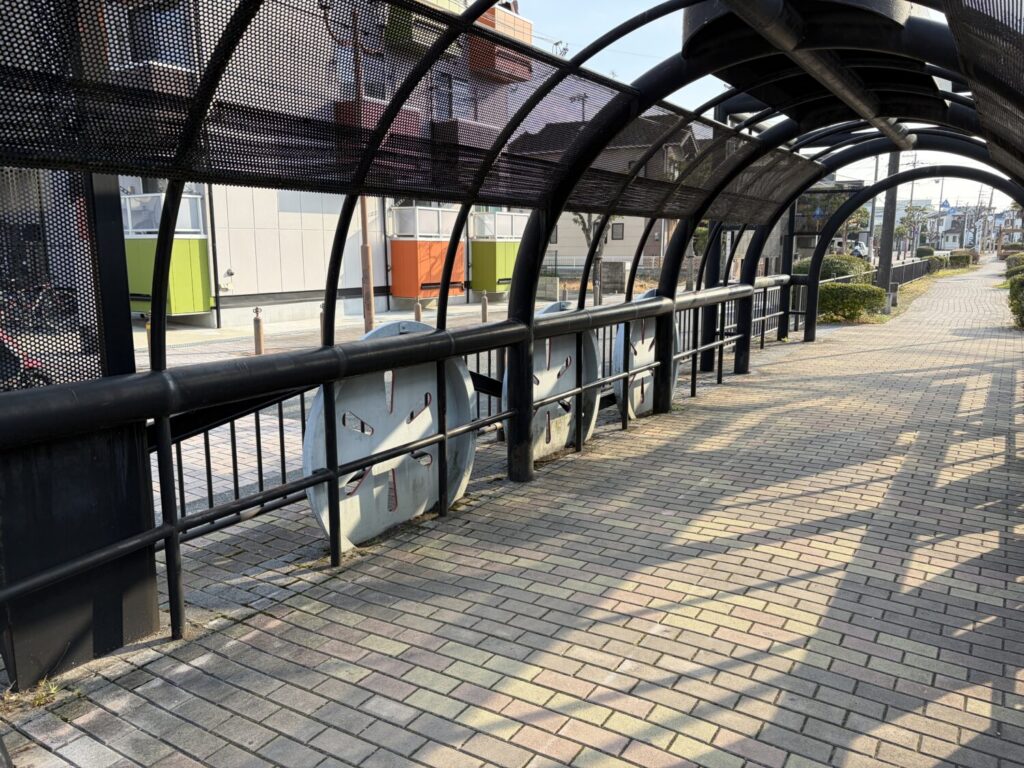 こちらにあるのはアーチ形のトレリスで、当時、陸軍で使われた砲弾や火薬を禁野火薬庫から各地に運んだ蒸気機関車を表しているようです。その証しにこのトレリスには大きな車輪が。実際通ってみると意外と大きいので、ずいぶんたくさんの火薬を運んでいたんでしょうね。
