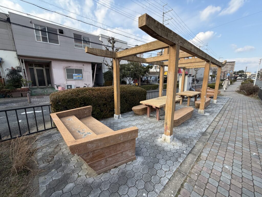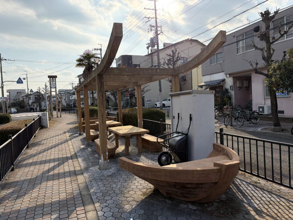 こちらは「パーゴラ」です。パーゴラもまた、格子状の屋根を持つつる棚のことで、庭やウッドデッキに設置するものです。そして、こちらは船の形をしています。どうやら、江戸時代の三十石船を表しているよう。江戸時代から明治初期にかけて、三十石船は京都と大阪を結んでいた淀川の定期船です。江戸時代も戦争時代も同様に、枚方は物資を運ぶのに重要な中継地点だったのですね。