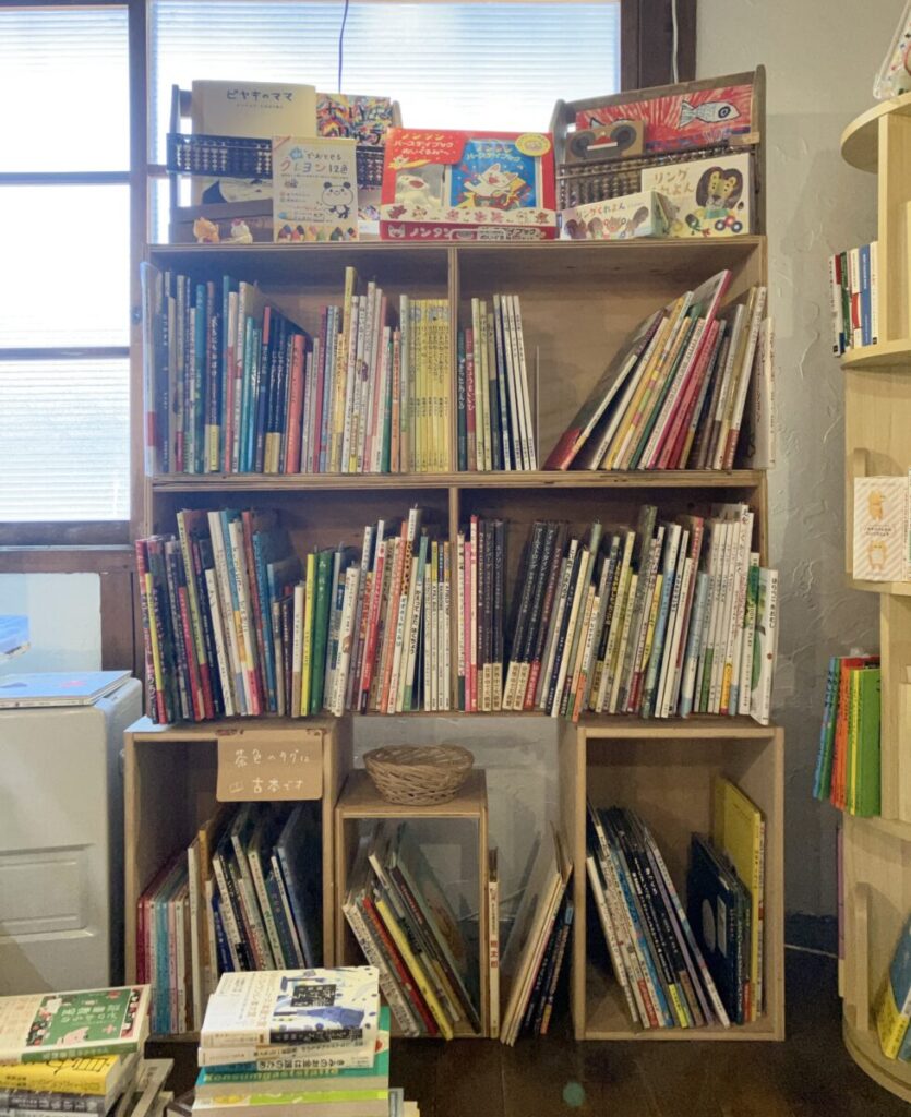 こちらは絵本コーナー。古本と新刊がほどよく混じり、床に座って読めるようになっています。店内には小さなお子さんを連れたママやパパの姿も見かけました。
