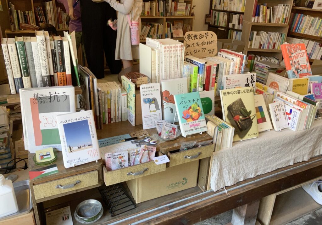 パレスチナ問題や戦争を扱った書籍コーナー。ページをめくるたび、遠い国の出来事が世界の現実であることに気づかされます。