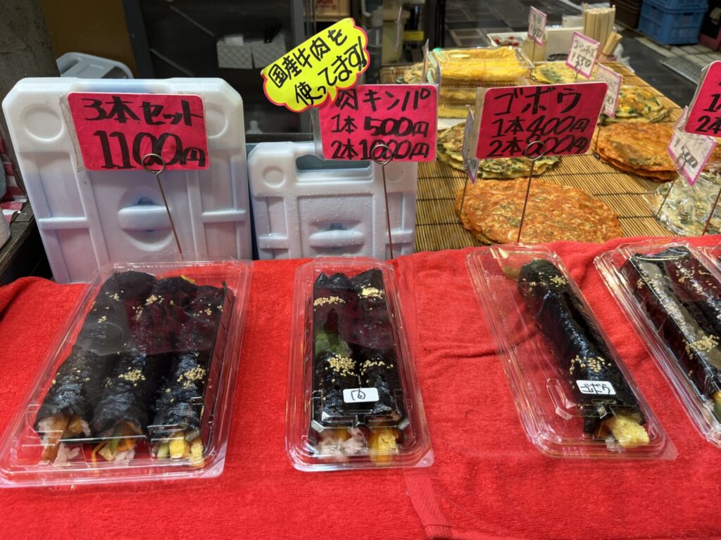 そのほかにも、よく知られている韓国のキンパや豚足なども並んでいました。食べ歩き用にミニキンパにしているお店もあったので、食べ歩きをしながら商店街をぶらぶらするというのもいいですね。