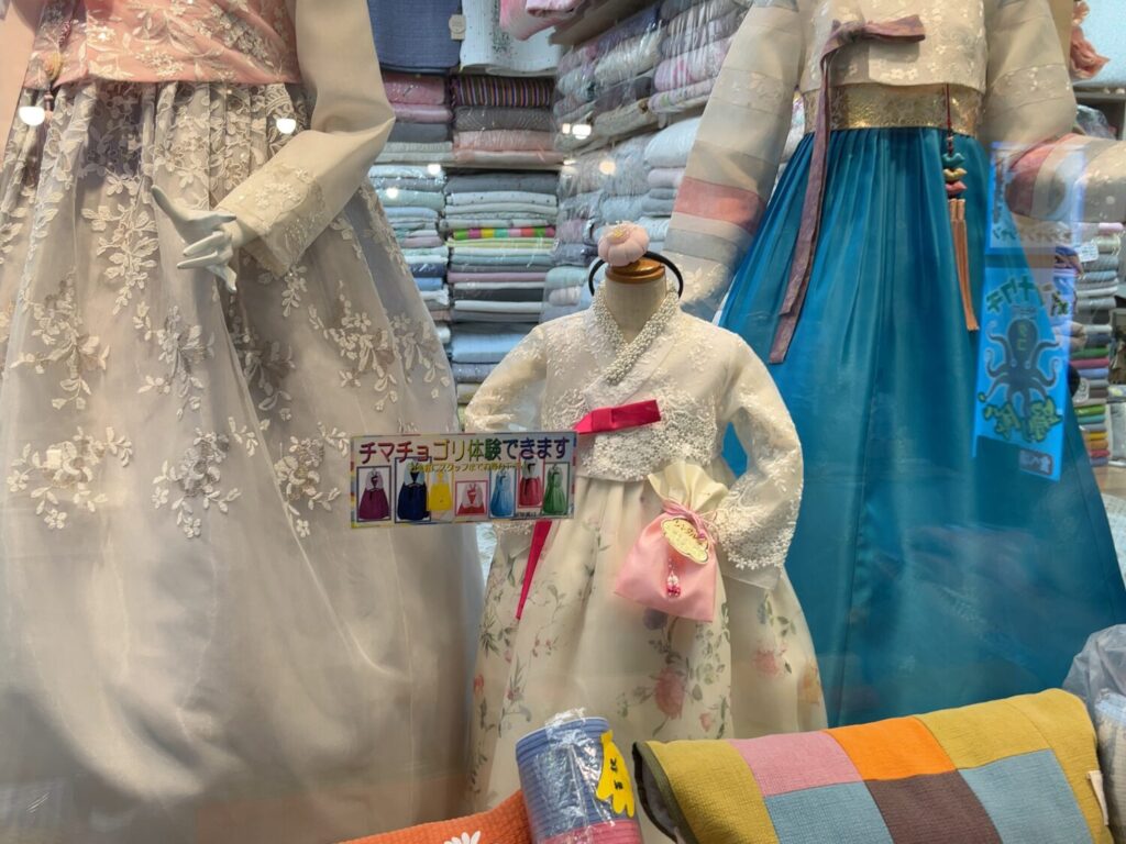 鶴橋商店街をぐるっと見て回ったところ、チマチョゴリを扱っているお店はそう多くはない印象だったので、「このチマチョゴリ着てみたいな」と思ったらすぐ体験するのがお勧めです。