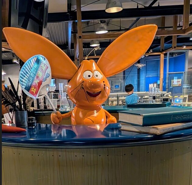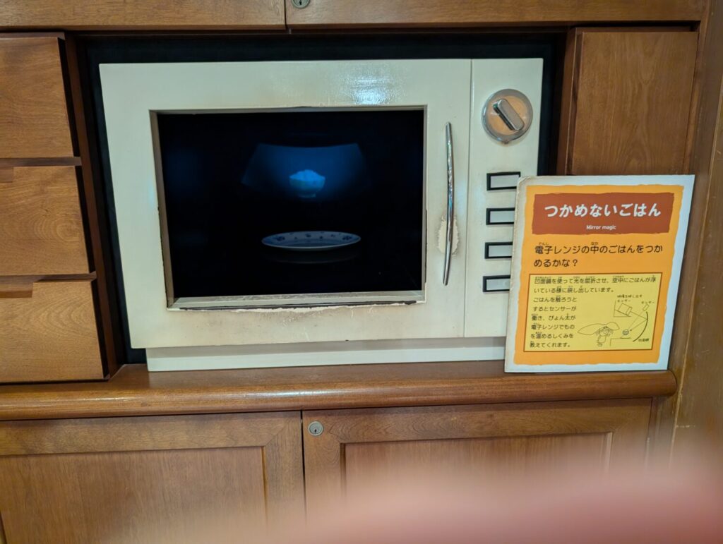 これは凹面鏡(球面が内側にくぼんでいる鏡)を使って、浮かんでいるように見せています。ごはんを触ろうとすると、ぴょん太(5-Daysこども文化科学館のキャラクター)が電子レンジでものを温めるときの仕組みを解説してくれます。