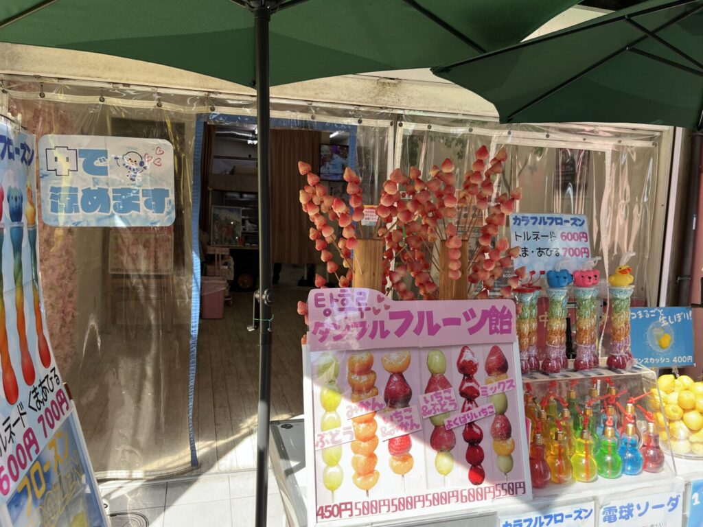 女子といえばスイーツ。こちらはタンフルです。食べ歩きができるように棒に刺して売っています。タンフルといえば、一時話題になったグルメでもありますが、そんなカラフルで話題性のあるスイーツは、大阪コリアタウンが発信源でもあります。