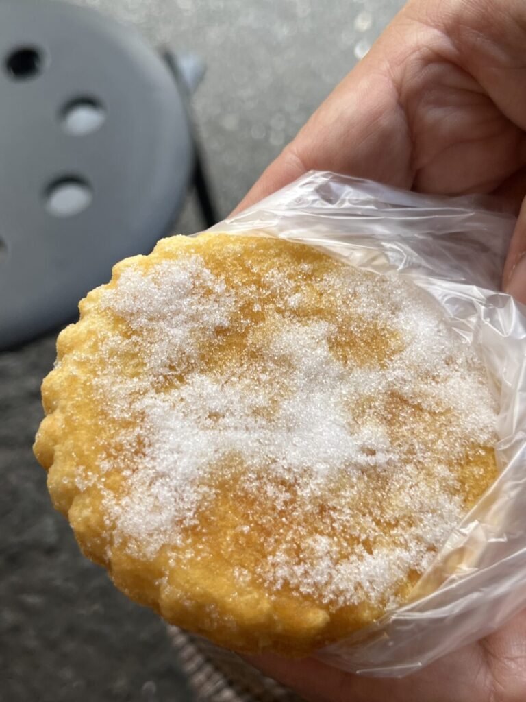 こちらは油餅という韓国のスイーツです。餅粉の生地をごま油で揚げて砂糖をまぶしています。その場で揚げてくれるので熱々が食べられますよ。甘くてなんとなく昔食べたことがあるような懐かしい味です。油餅も様々な種類のものがあるので、食べ歩きにぴったりですね。