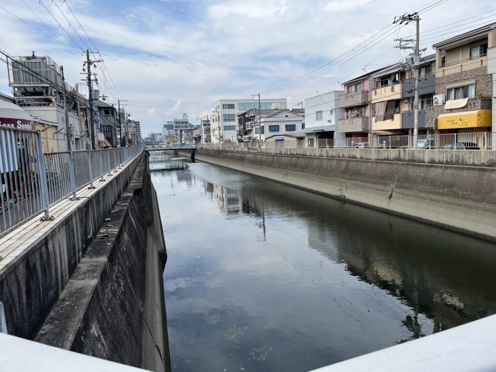 御幸通商店街の最終地点は百済門で、百済門を出ると、すぐ川が流れ御幸橋が通ります。