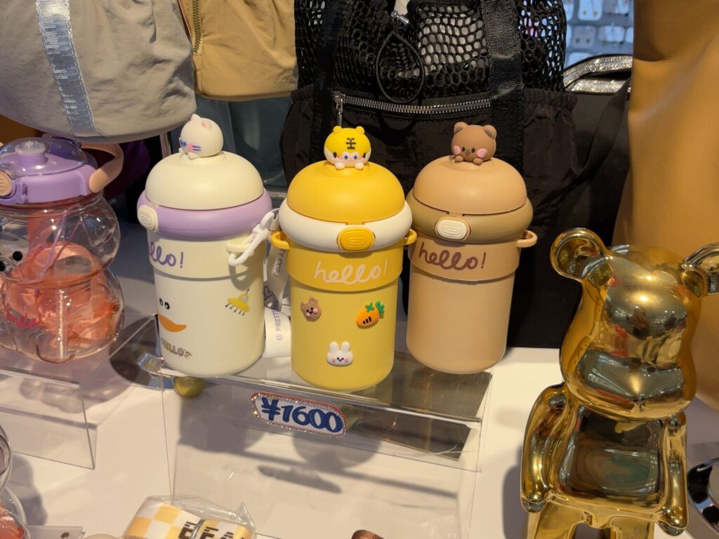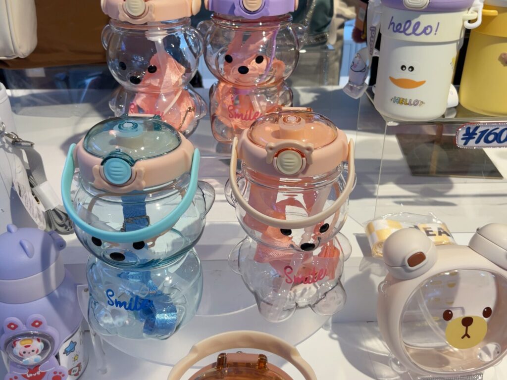 韓国雑貨のお店もいくつかあります。こちらには、透明で中身が見える水筒や、キャラクターがあちこちに付いた水筒など、日本では見かけない商品がたくさん。かわいくてポップなものが多いので、きっと女子高生が見たら持ちたくなってしまうのでしょう。店内は常に若い女性で満員です。