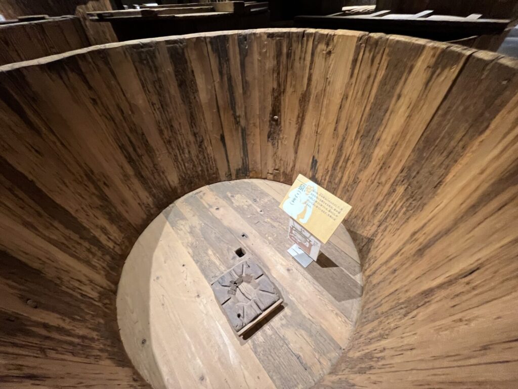 館内は2階建てで、順路に従って1階から見学を始めます。まずは酒造りの工程を紹介する展示があり、精米、洗米、蒸し、麹づくり、発酵、搾りといった工程が、実際に使われていた道具とともに丁寧に解説されています。中でも目を引いたのは、巨大な木桶と櫂棒。職人たちはこれを使ってもろみをかき混ぜていたとは、酒造りの重労働さがわかります。