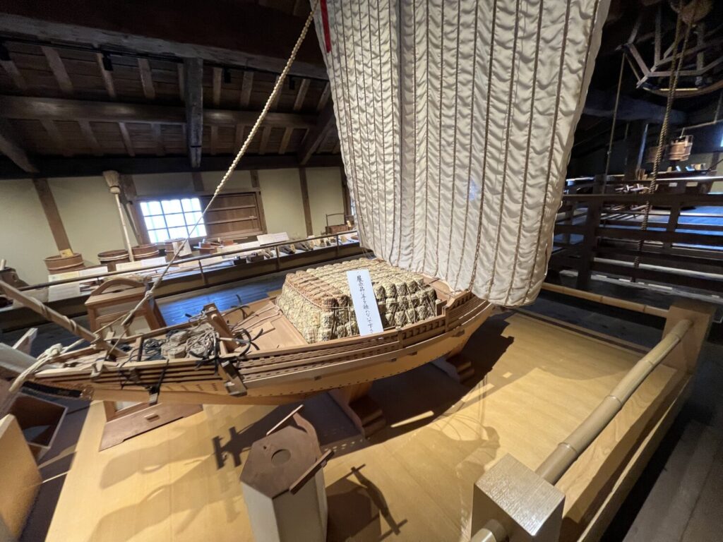 こちらは樽廻船です。江戸にお酒を送っていたそうですが、当時はこのように船に積んで運んでいたのですね。江戸でも灘のお酒は人気があったのでしょう。酒樽の数の多さにびっくりです。
