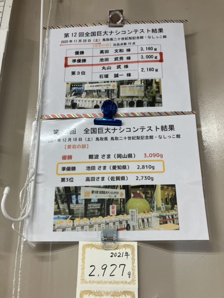 その後は鳥取県で開催された「全国巨大ナシコンテスト 愛宕梨部門(鳥取二十世紀梨記念館・なしっこ館主催)」にも出品。全国から集まる愛宕梨の中で、2年連続準優勝を果たしています。