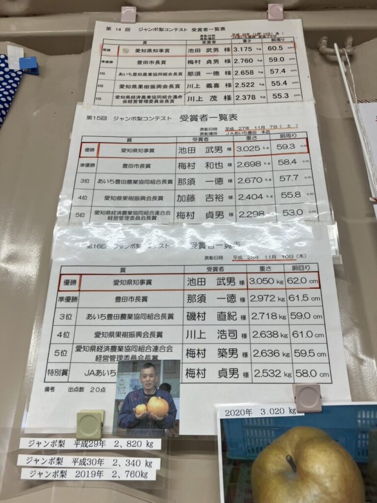 2014年に行われた「第14回 とよたジャンボ梨コンテスト(JAあいち豊田主催)」では、3175グラムのジャンボ愛宕を出品し、みごと優勝を果たしています。