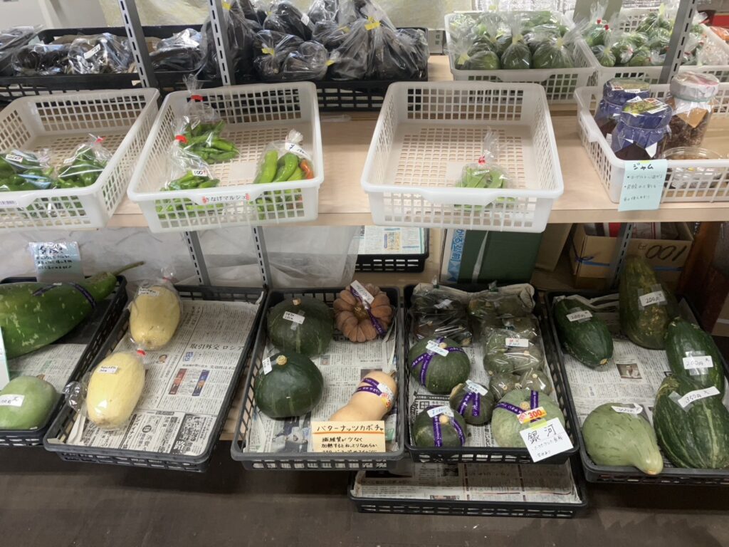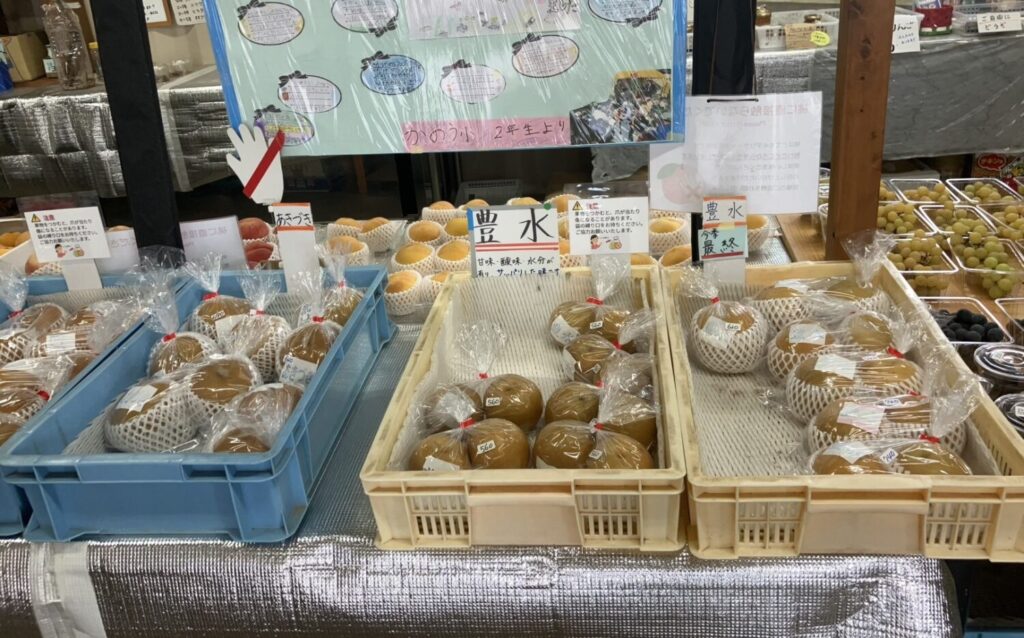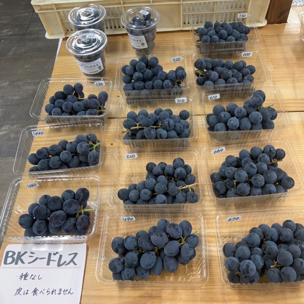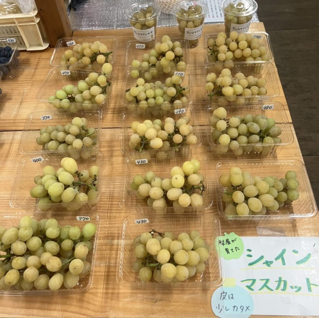 店内では近所の人や農家仲間さんが育てた野菜も委託販売。「梨屋が育てたブドウ」は大人だけでなく子どもたちにも人気の商品です。