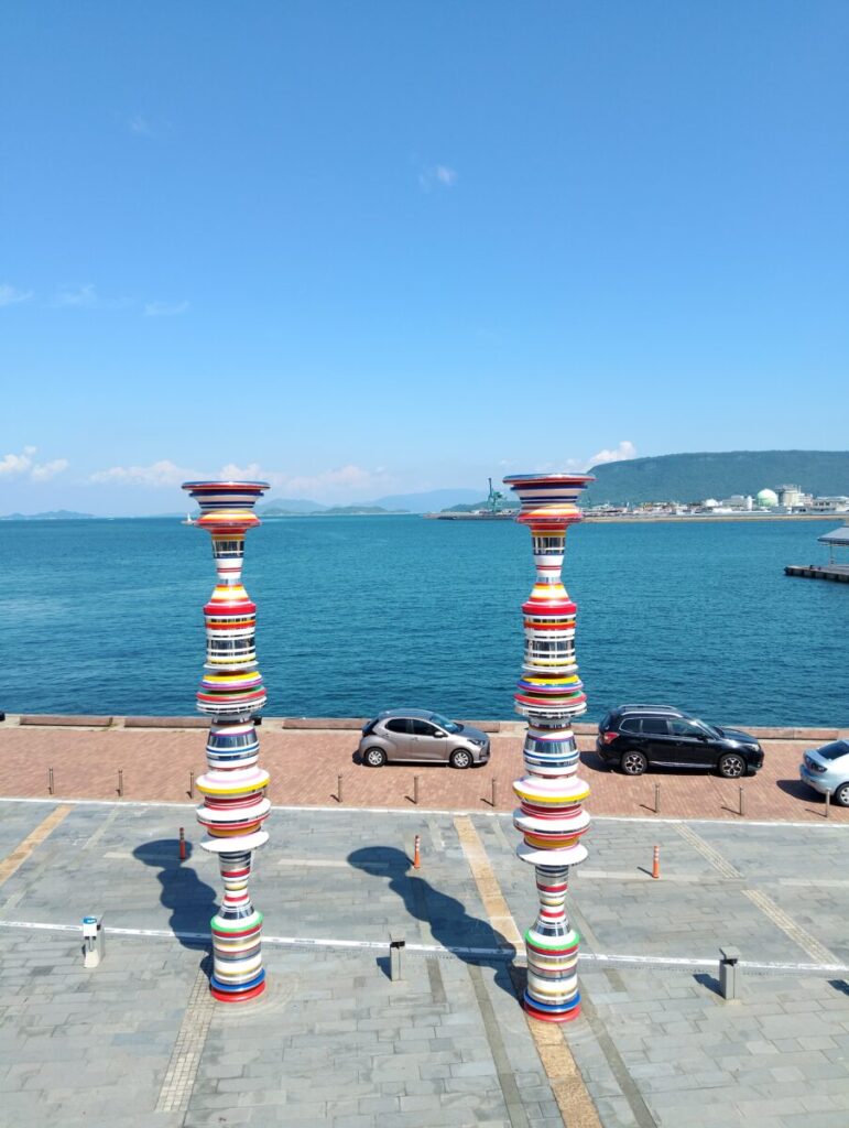 高松港のシンボル的存在。鏡面の表面はカラフルに彩られており、見る角度によってさまざまなものが映り込むおもしろい作品です。