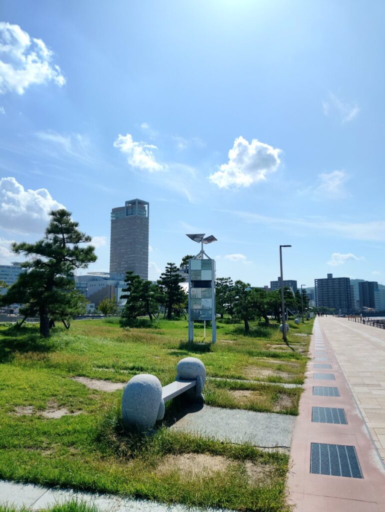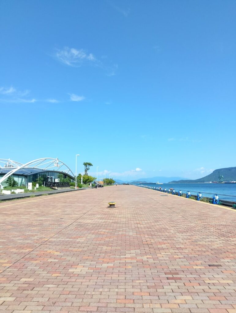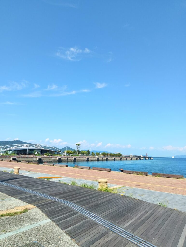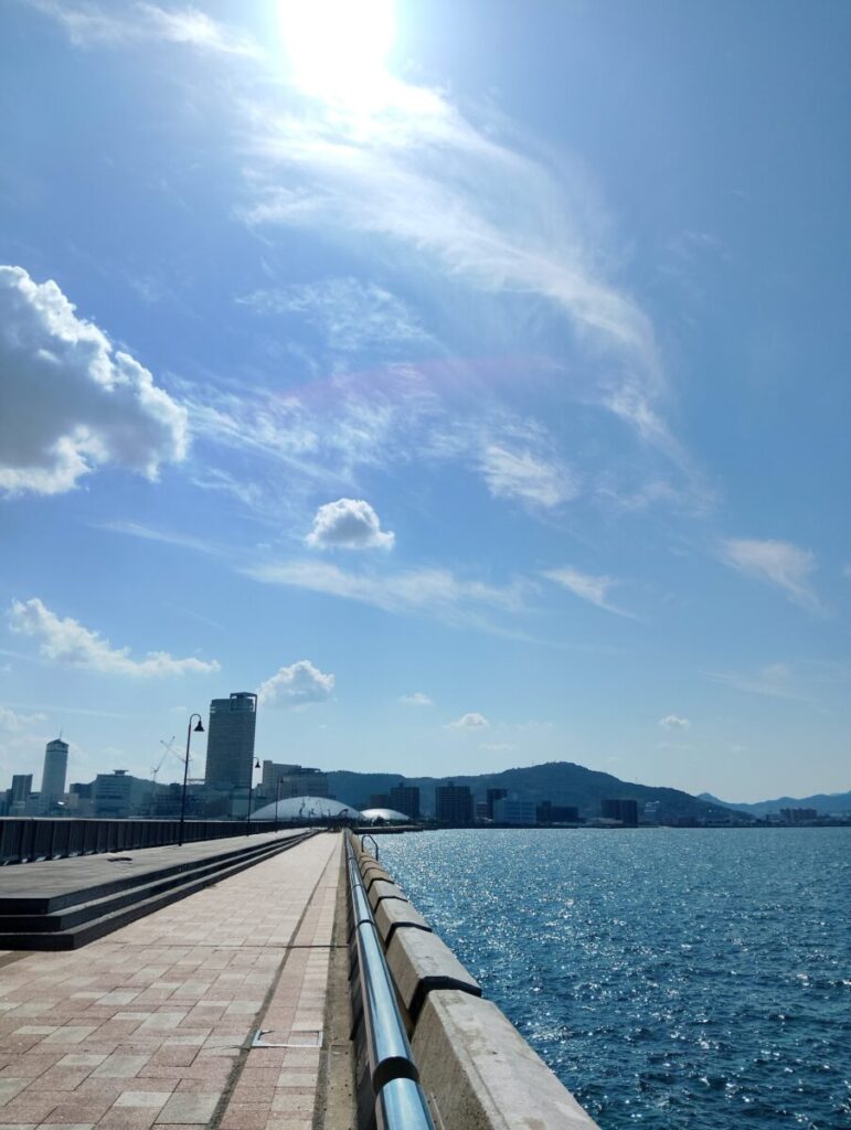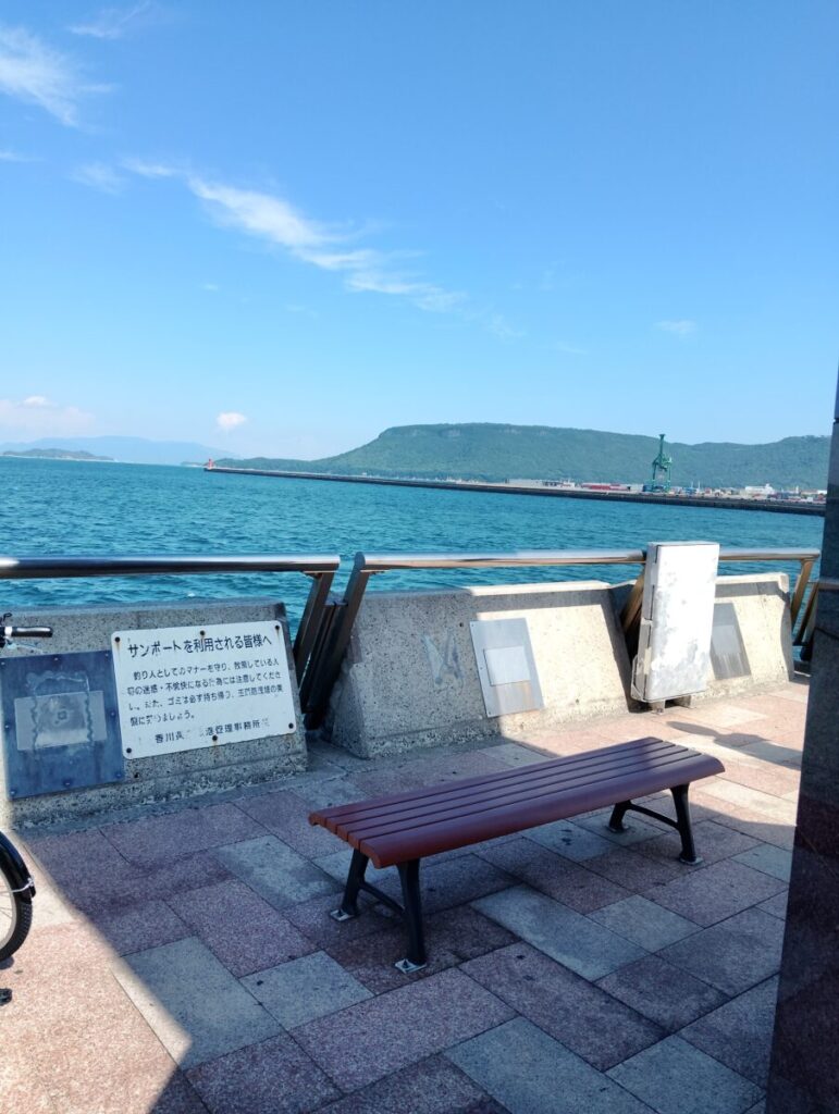 左側は高松の街、右側は海。晴天のため、太陽の光で水面がキラキラ光り秋晴れを感じさせてくれる遊歩道でした。