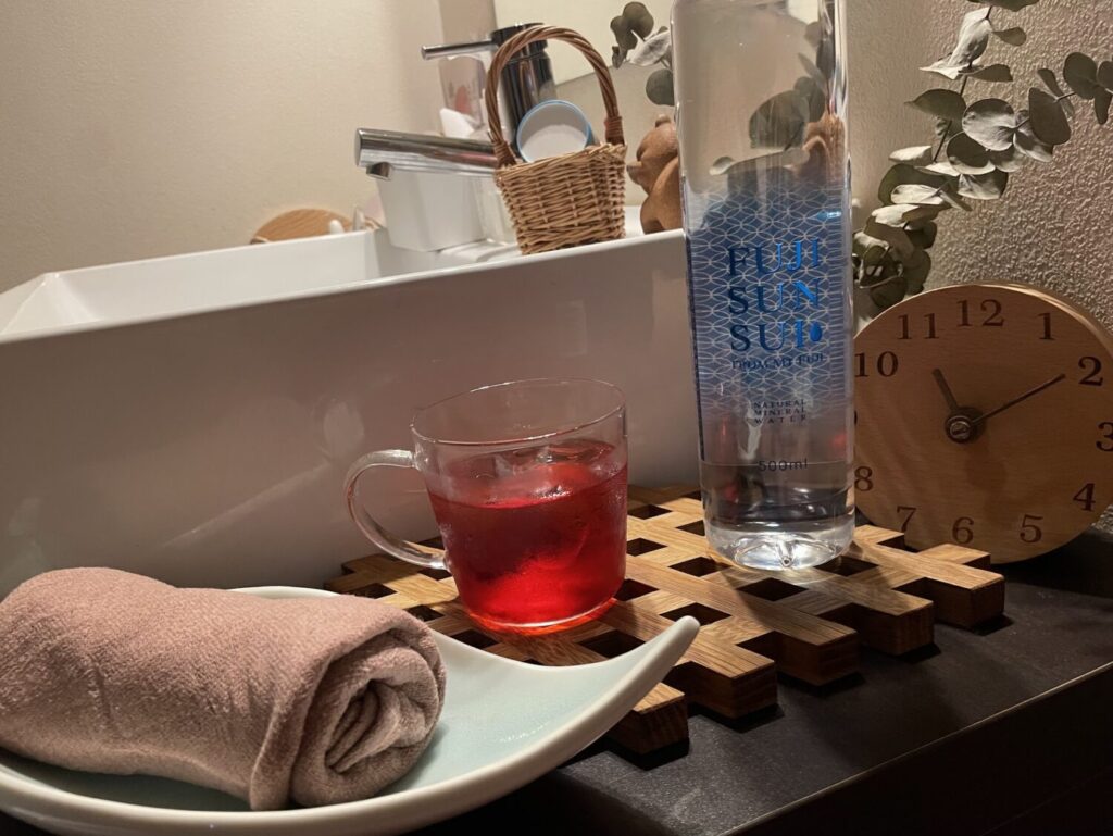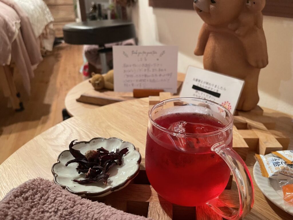 落ち着いた照明の部屋に、BGM。椅子に腰掛けると、提供されるハイビスカスティーの香りに癒されます。あらかじめ用意されていたフットバスで、足元からじわじわと温まっていきます。