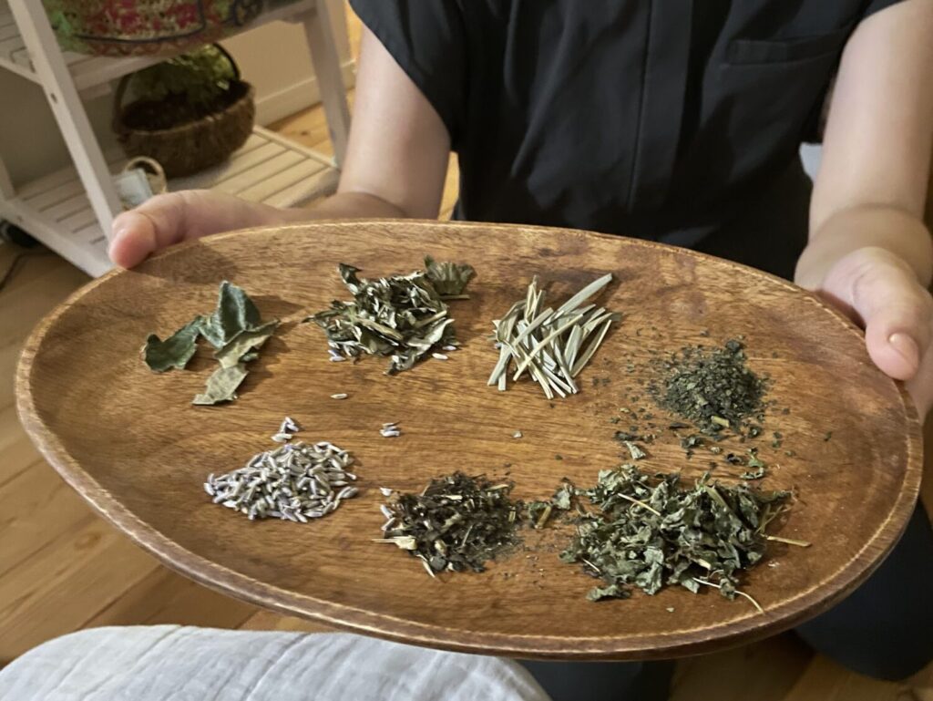 90分の施術、まずはハーブ蒸しから。ハーブ蒸しに用いられるハーブ類は、事前のカウンセリングの内容からイセキさんが選んだもの。