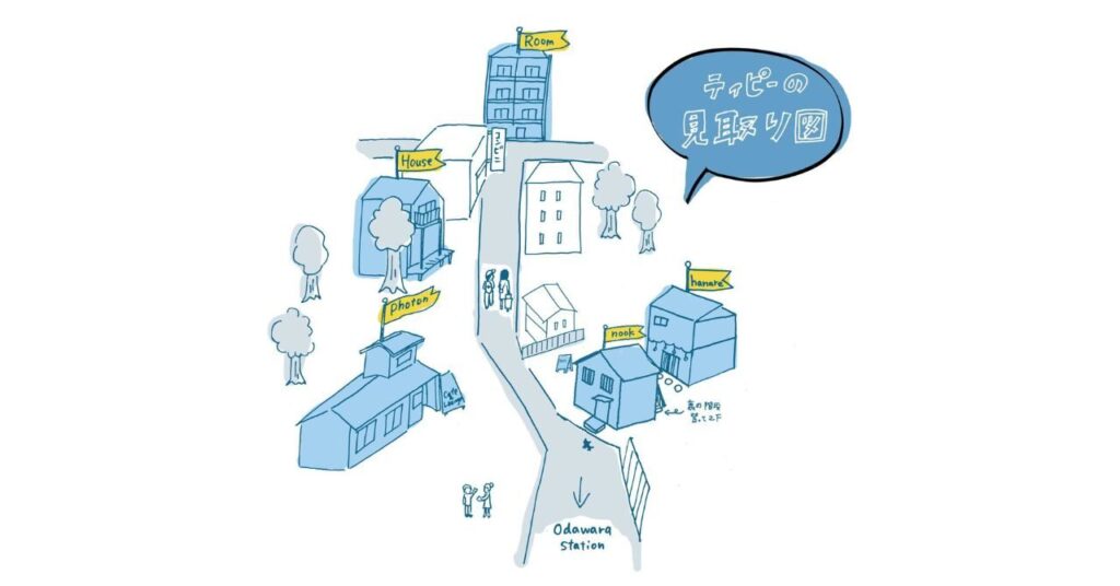 「Tipy records inn」シリーズの5棟はいずれも徒歩1分ほどの距離にあり、好みに合わせて宿泊スタイルを選べます。