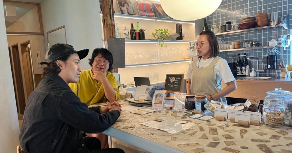 「Tipy records inn photon」では、宿泊者だけでなくカフェ&ラウンジにふらりと立ち寄る人たちが、コーヒーやお酒を片手に自然と会話を交わします。旅人と地元の人が同じテーブルを囲み、話に花が咲くことも。