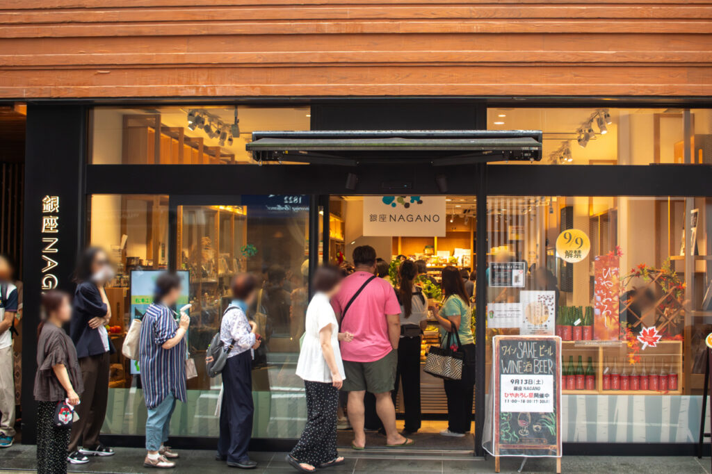 銀座NAGANOがあるのは、東京メトロ銀座線 銀座駅A1出口すぐのところ。黒に木目調の装飾が映える和モダンなビルが目印です。お店に伺った日は、人気商品「伊那のまゆ」の入荷日ということもあり、開店前から多くのお客さんで賑わっていました。